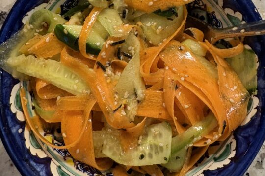 В этом салате важна нарезка Ингредиенты: Приготовление: Чистилкой для овощей нарезаем морковку и огурец, добавляем соевый соус, кунжутное масло. Посыпаем кунжутом и любимыми азиатскими специями.