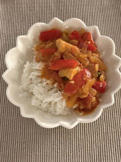 3. Добавляем нарезанную кусочками белую рыбу и томим ее минут 8-10 в соусе. Добавляем базилик и подаем с рисом.