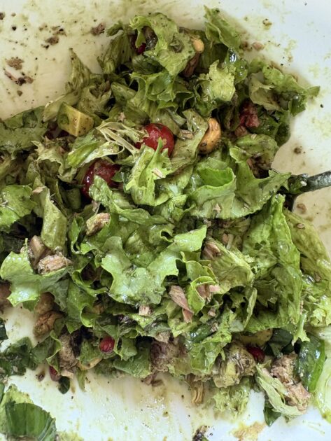 Тунец разминаем вилкой, салат и авокадо режем, все остальное вмешиваем. Смесь семян у меня всегда есть в холодильнике, там 7 видов – чиа, тыквенное, подсолнечное семена, лен, мак, кунжут и семя конопли. Добавляю эту смесь в йогурты и в кашки дочке утром, обогащая протеинами и клетчаткой.