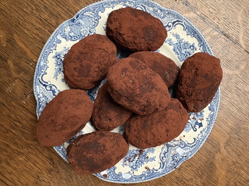 - Смешать все ингредиенты. Какао я беру хорошего качества и без сахара (Valrhona), а чай добавляет сочности, нужно 3-4 столовых ложки. Оставить немного пропитаться, потом сформировать пирожные в форме картофелин и обвалять их в какао.