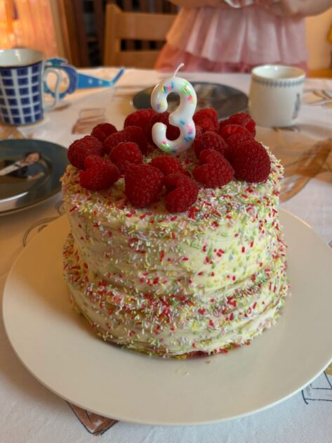 12. Приготовление крема 3 (он лучше всего подходит для цветных детских тортов и отлично комбинируется с малиной): взбить слегка маскарпоне, добавить сметану и сахар и взбить основательно. Я промазывала этим кремом коржи и прокладывала каждый второй корж замороженной малиной, пальцами разбивая ее на мелкие кусочки. Потом промазывала по бокам, выравнивая торт кремом, оставляла на ночь в холодильнике на пропитку, и на утро украшала.